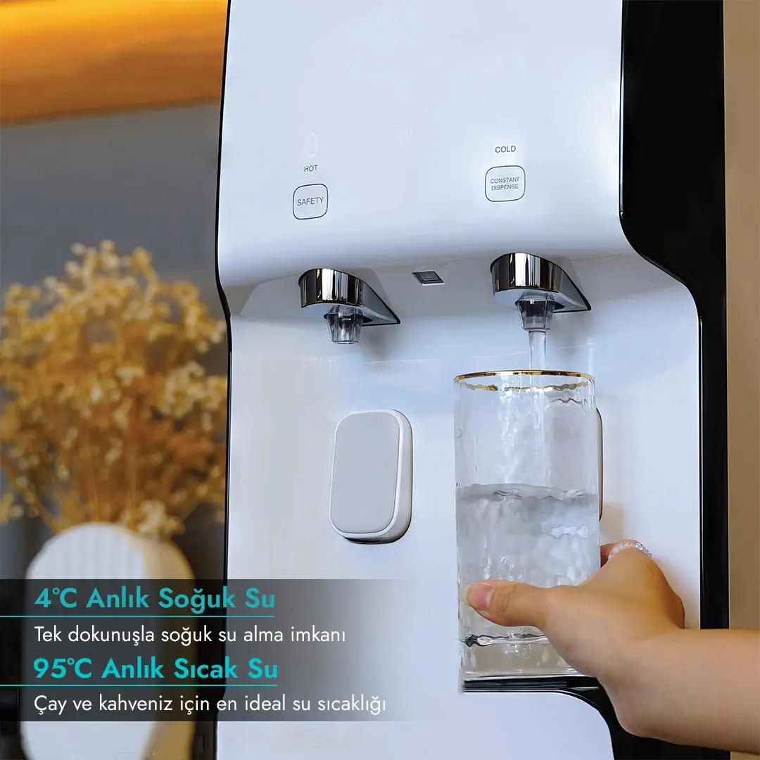 It ensures access to healthy water by highly efficiently purifying chemical residues and microorganisms that can be found in tap water. By preventing plastic waste, this system offers an eco-friendly approach while reducing your water expenses.