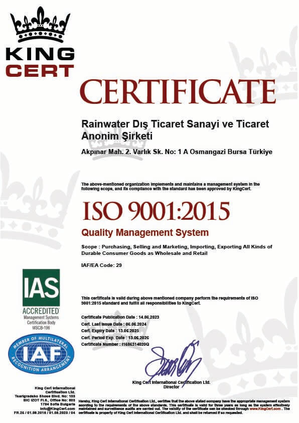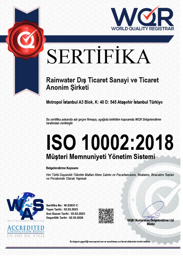 Uluslararası Yönetim Disiplini: Başarımızın sırrı, yönetimdeki disiplinimizdir. Rainwater, tüm iş süreçlerinde uluslararası ISO 9001 Kalite Yönetim Sistemi'ni titizlikle uygulamaktadır. Bu standart, ürünlerimizin seçiminden satış sonrası desteğe kadar her aşamanın kontrol edildiğinin, izlendiğinin ve sürekli iyileştirildiğinin küresel bir garantisidir.